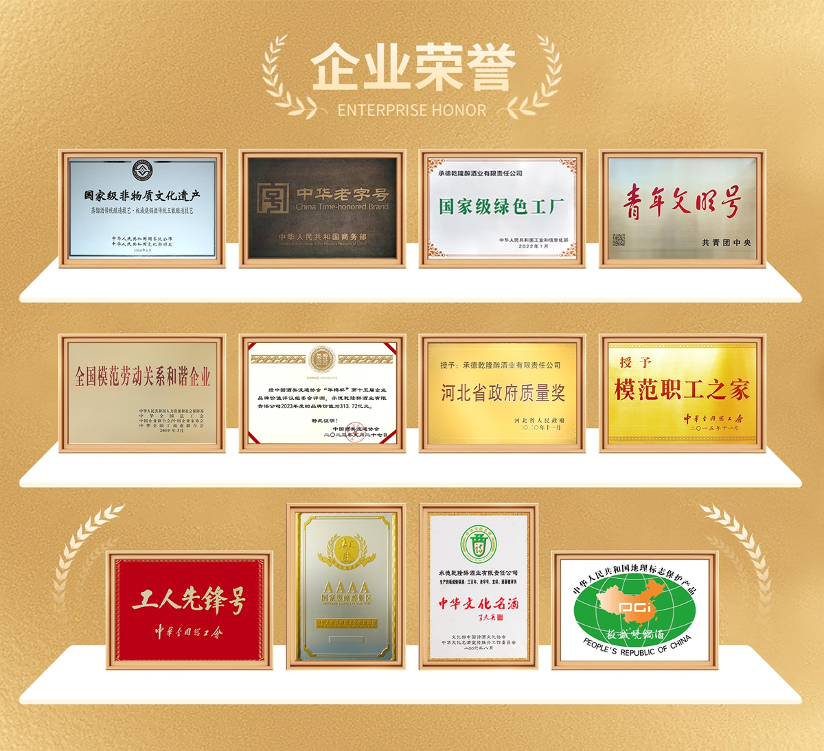 企業(yè)快速發(fā)展的同時,也贏得了社會的廣泛贊譽。公司擁有國家專利8項,注冊商標124個,先后榮獲“中華老字號”、“國家級非物質(zhì)文化遺產(chǎn)”、“國家地理標志保護產(chǎn)品”、“國家級綠色工廠”、“中華文化名酒”、“全國模范職工之家”、“全國模范勞動關系和諧企業(yè)”、“國家級青年文明號”、“全國工人先鋒號”“國家AAAA級景區(qū)”、“河北省政府質(zhì)量獎”“第十五屆“華樽杯”板城品牌價值449.82億元”等上百項榮譽。