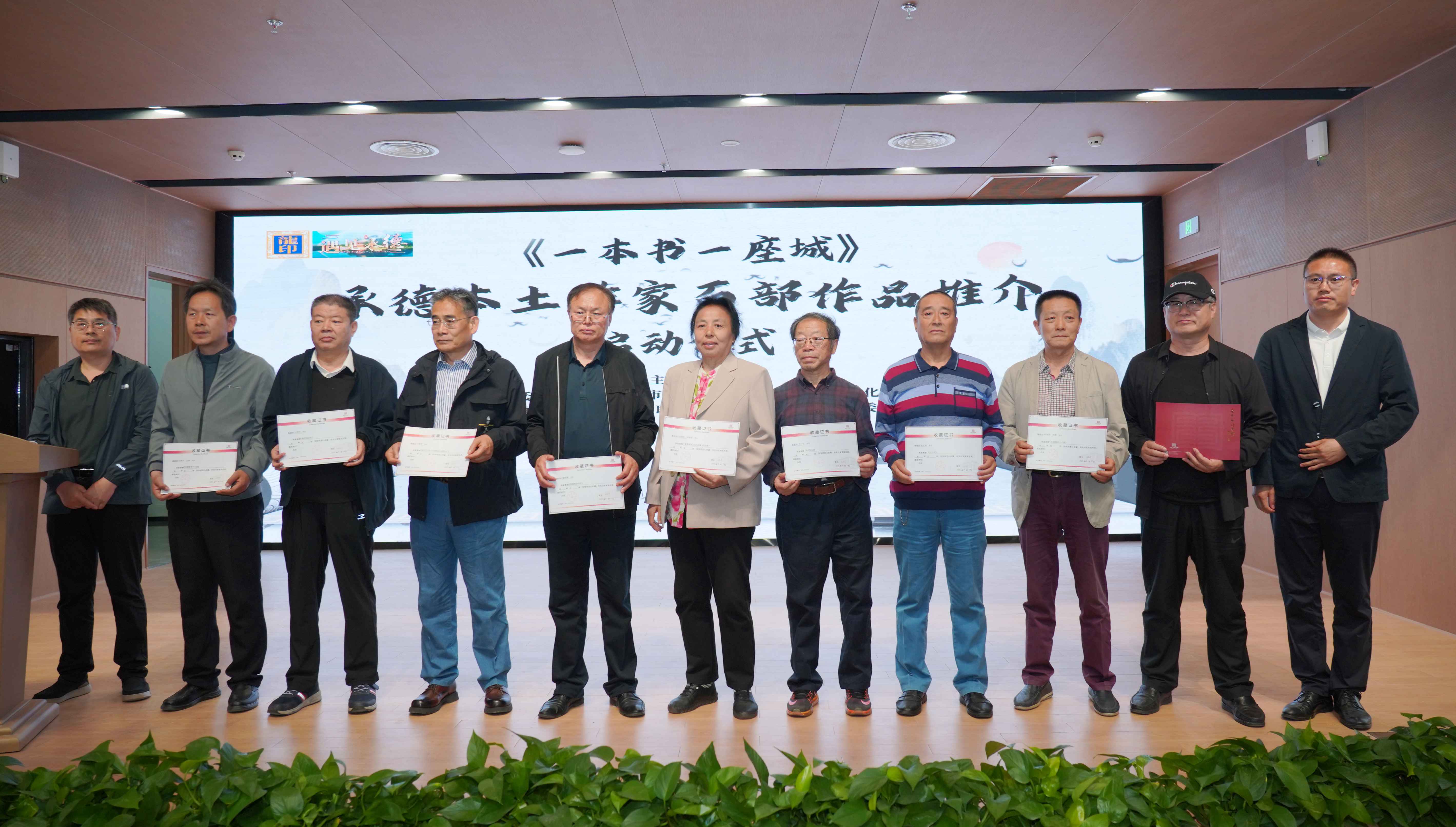 中共承德市委宣傳部三級調(diào)研員張穎和承德廣播電視臺總編輯楊潤忠為作家老師頒發(fā)收藏證書。
